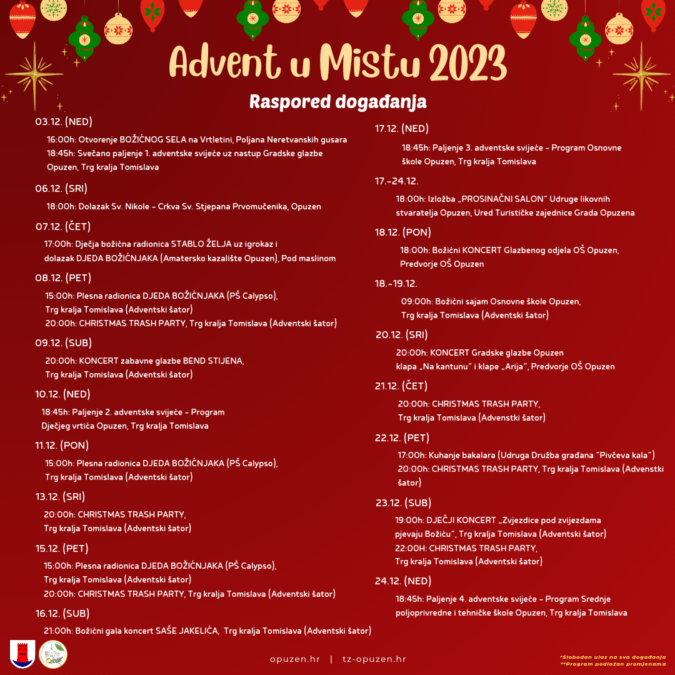 U organizaciji Grada Opuzena, Turističke zajednice grada Opuzena, gradskih ustanova, Osnovne škole Opuzen, Srednje poljoprivredne i tehničke škole Opuzen i organizacija civilnog društva program “Advent u Mistu 2023.” započinje u nedjelju, 03. prosinca 2023. godine. Za Vas smo pripremili adventska događanja na nekoliko lokacija, bogat i sadržajan program u kojem će svatko moći pronaći nešto za sebe.